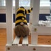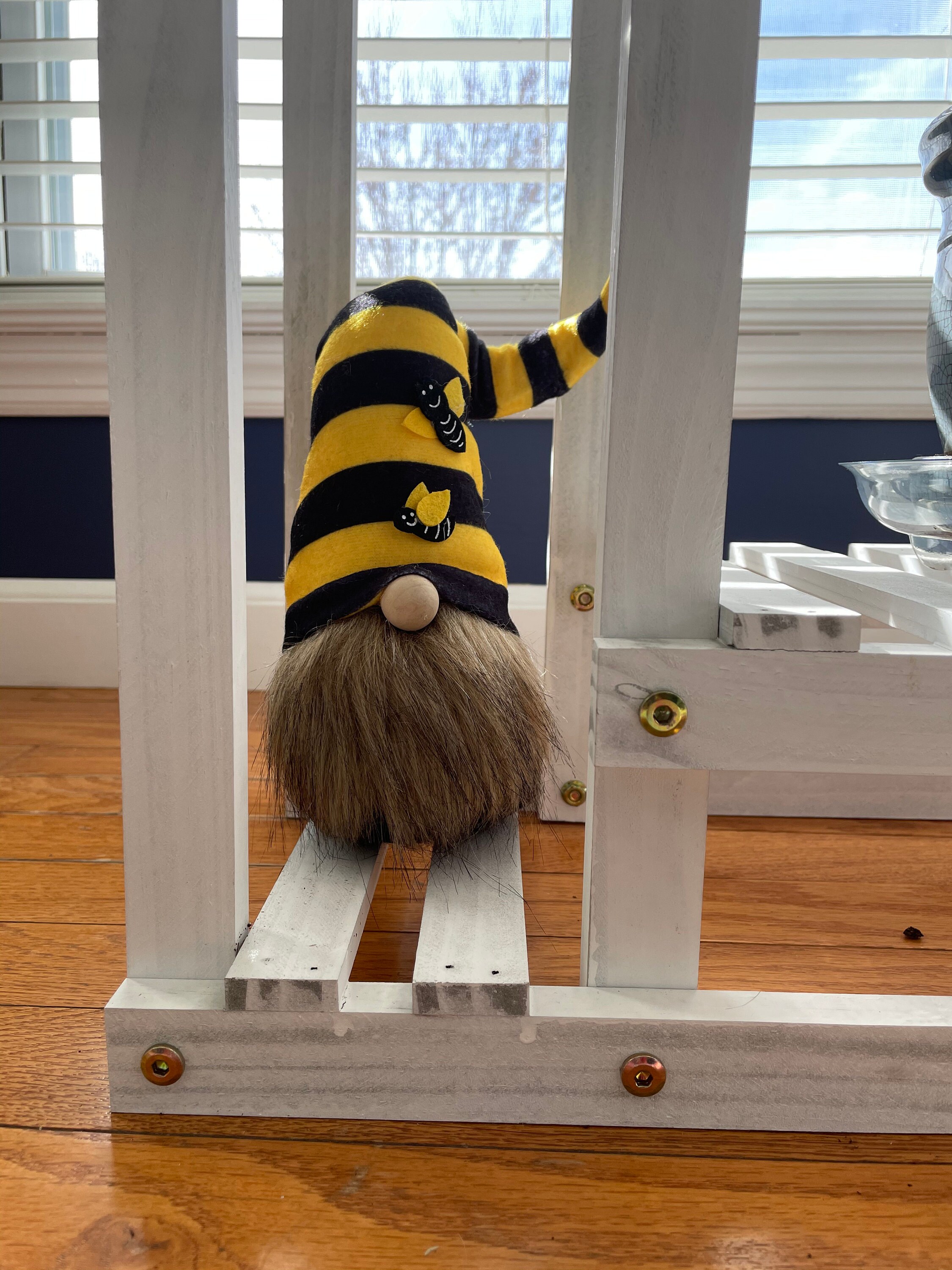 HoneyBee sports a yellow and black hat with two bees on it. He is 15" tall and has a brown beard and wood nose. He loves honey, gardening and sunbathing. The nicest most easy going gnome I've ever met.